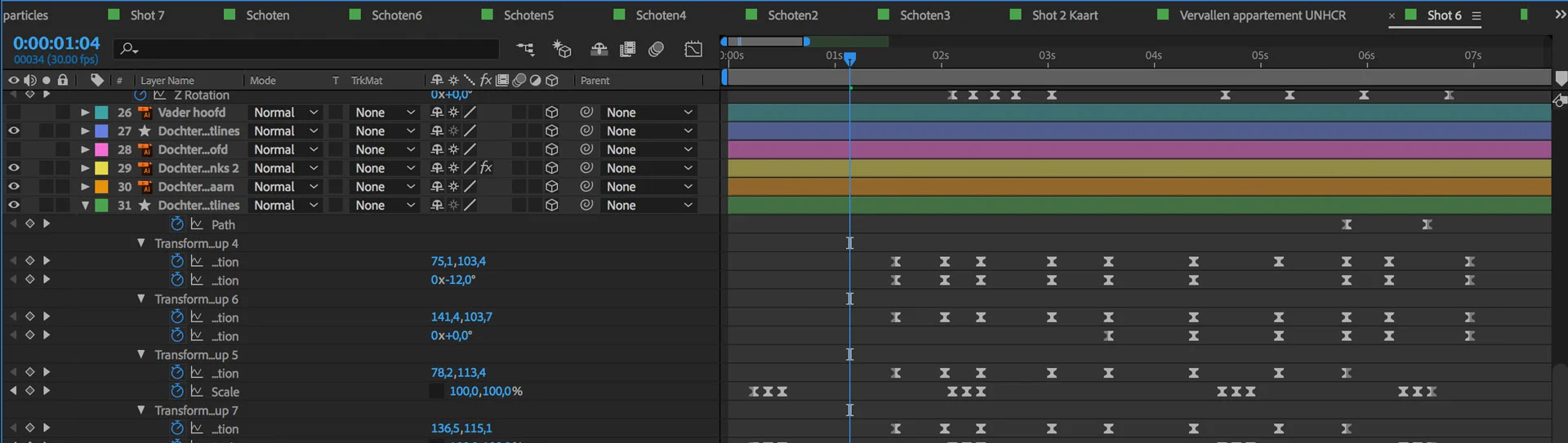 Een animatiefilm is dus een hele puzzel! In het software project (wij werken voornamelijk in After Effects van Adobe) uit dit zich dikwijls in tientallen of soms wel honderden lagen en composities met daarin zogeheten keyframes en effecten. Keyframes zijn de punten, die de animator in een laag of effect zet, waarop iets verandert of gebeurt. Deze kunnen we dan nog met de hand verder finetunen met bijvoorbeeld curves, sliders, getallen en wiskundige formules.