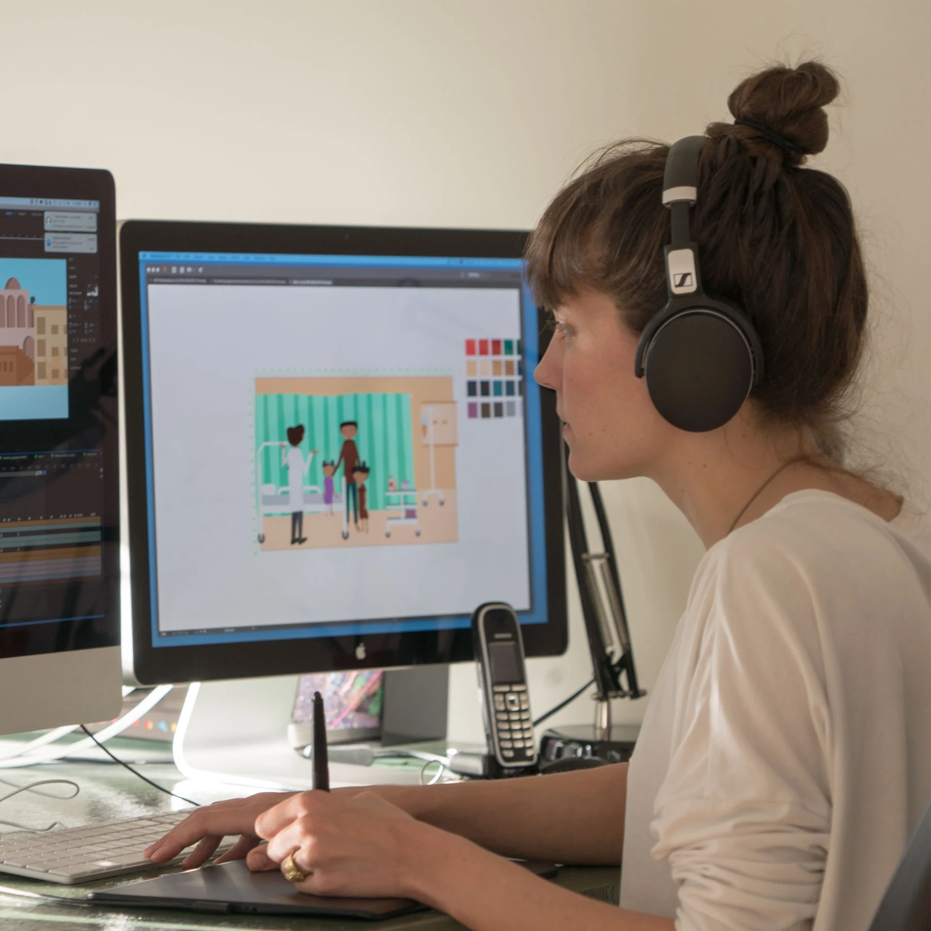 Tenslotte zorgen we voor de post-productie. We gaan aan de slag met de montage voor het editen, de beeldbewerkingen en de creatie van eventuele titels of andere lagen over de video heen. Op die manier kunnen we video en animatie met elkaar combineren, kleurcorrecties uitvoeren of zorgen voor het muziek- en sounddesign dat we netjes afmixen in het geheel.